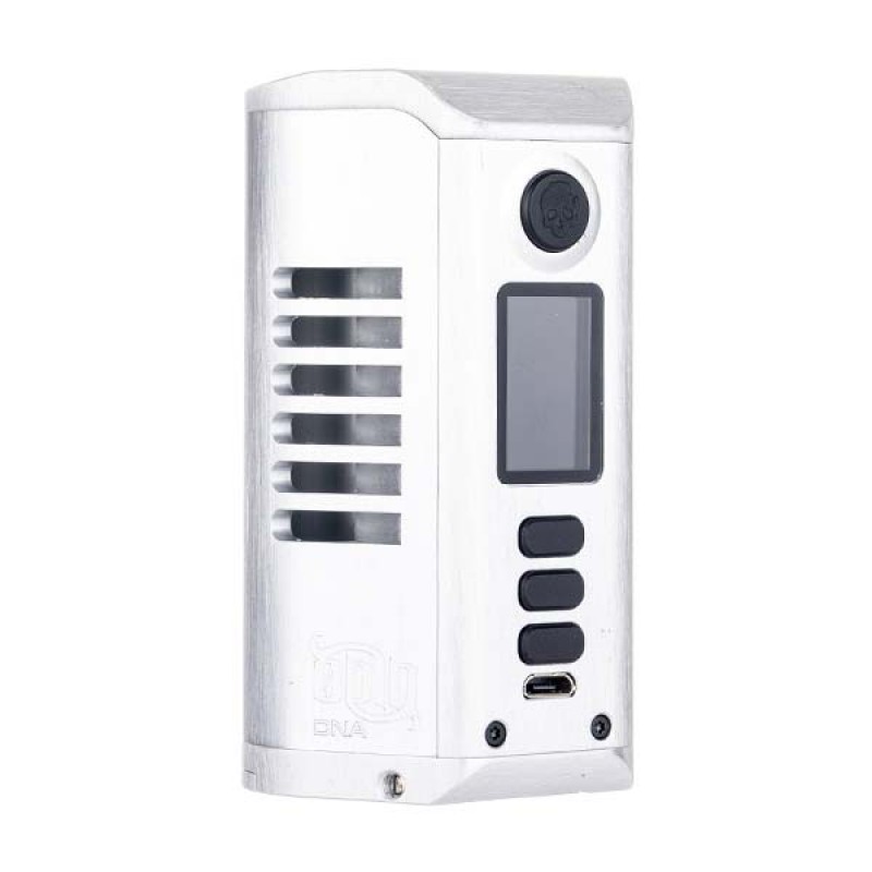 Constructed from zinc alloy and finished in either a brushed or matte finish, the Odin DNA250c mod is stylish and durable. On the front face of the mod is a 0.96" OLED colour display screen, a large skull inscribed firing button, two adjustment buttons and a mode selection button. Cooling fins are present down each side of the mod, which also ensures for a comfortable grip. Powered by dual battery cells, with a choice of either 20700 or 21700 sized batteries which are inserted via the bottom hinged battery door.