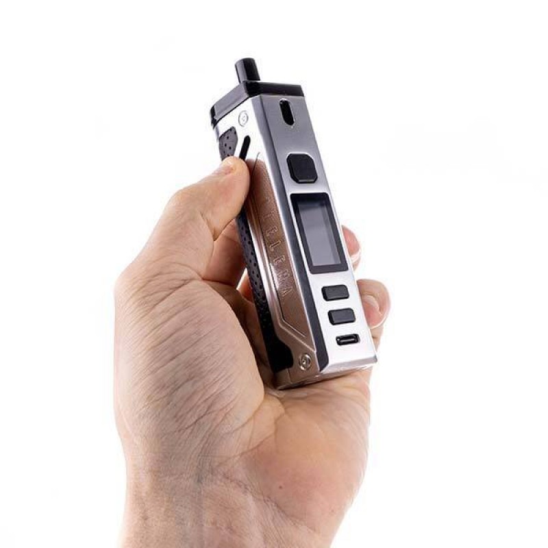 The Lost Vape Thelema pod mod is constructed from durable zinc alloy and high quality leather, offering a comfortable grip and luxurious look. Powered by a rechargeable 3000mAh battery, charged via type-C USB, and driven by Lost Vape's proprietary Quest chip the Thelema has a wattage range of between 5 - 80W. The body of the device features a large 0.96" TFT colour display screen, a large firing button and two control adjustment buttons.